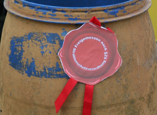 Siegel drauf - FreigemessenDie Strahlenfreigabe (das "Freimessen") zaubert juristisch die Radioaktivität aus Material weg, welches physikalisch natürlich weiter strahlt, denn Strahlung lässt sich nicht einfach abschalten. 2011 wurde dies in Heilbronn in einer sehens- und hörenswerten Aktion demonstriert.