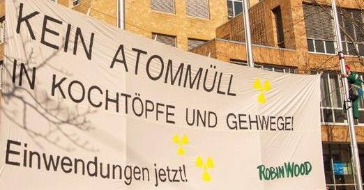 Robin Wood-Banneraktion vor dem UM am 13.2.2015 - Bildausschnitt. Foto: Robin Wood, Jens VolleWer unsere Forderungen nach mehr Verantwortung und Sicherheit beim Abriss der AKWs und beim Umgang mit dem Atom- und Abrissmüll unterstützen will, kann dies wie Robin Wood mit einer Kletteraktion vor dem Umweltministerium in Stuttgart tun: "Kein Atommüll in Kochtöpfe und Gehwege!" (Danke, Robin Wood! Foto: Robin Wood / Jens Volle. Video bei Fluegel.TV, Presseinfo bei Robin Wood).